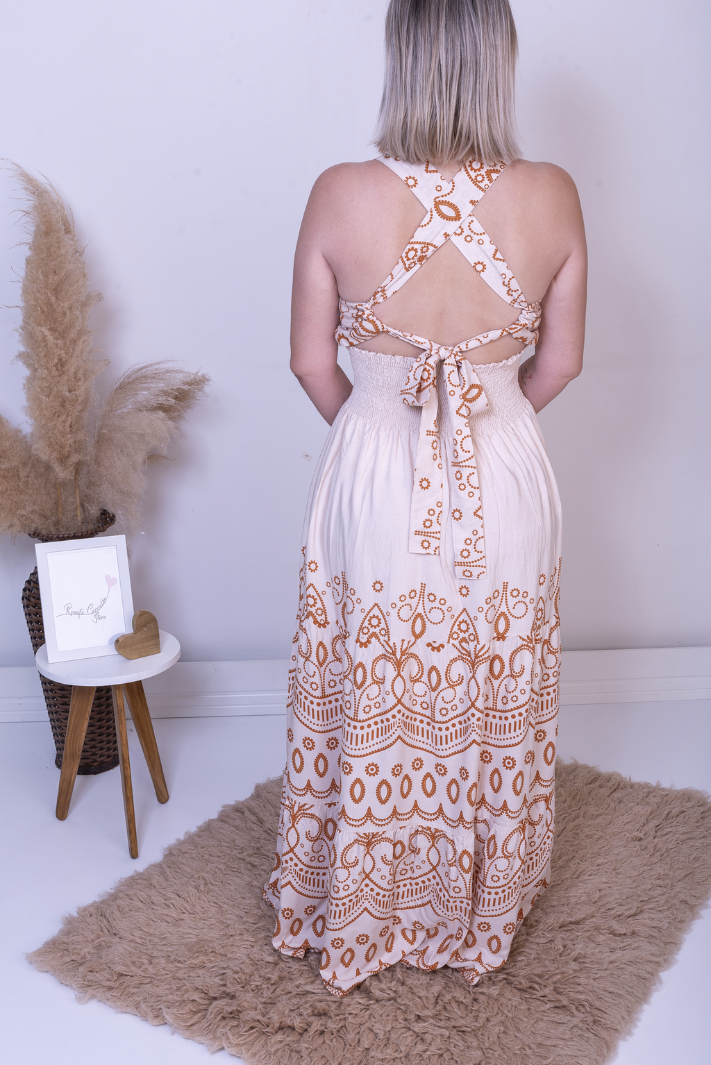 Vestido Longo Bege com Estampa Laranja Queimado, Alça de Amarrar e Bojo: Elegância Fluida com Toque Boho